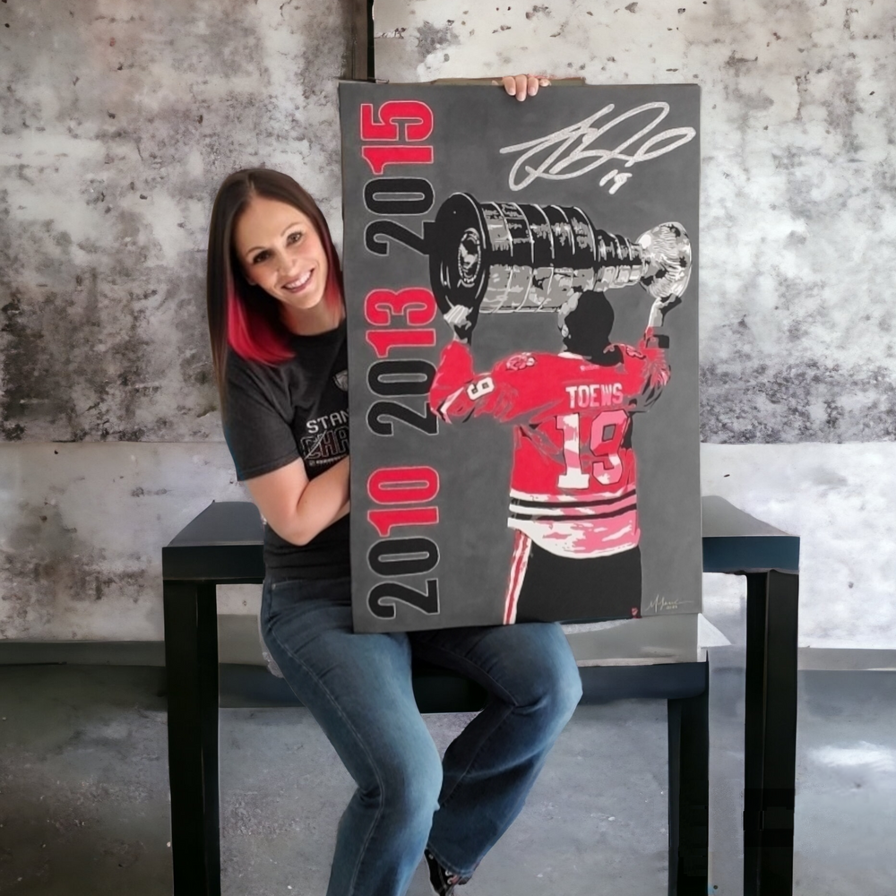 A lifelong Chicago sports fan and musician, much of Melissa's work is still rooted in what she loves: Chicago teams and music of all genres. But with a love for the ocean and all wildlife, many pieces will showcase colorful fantasy dream worlds and include animals of all sizes and species. Whether it's a nod to a favorite memory or the pure joy of color and light, her art is designed to make people feel joy.